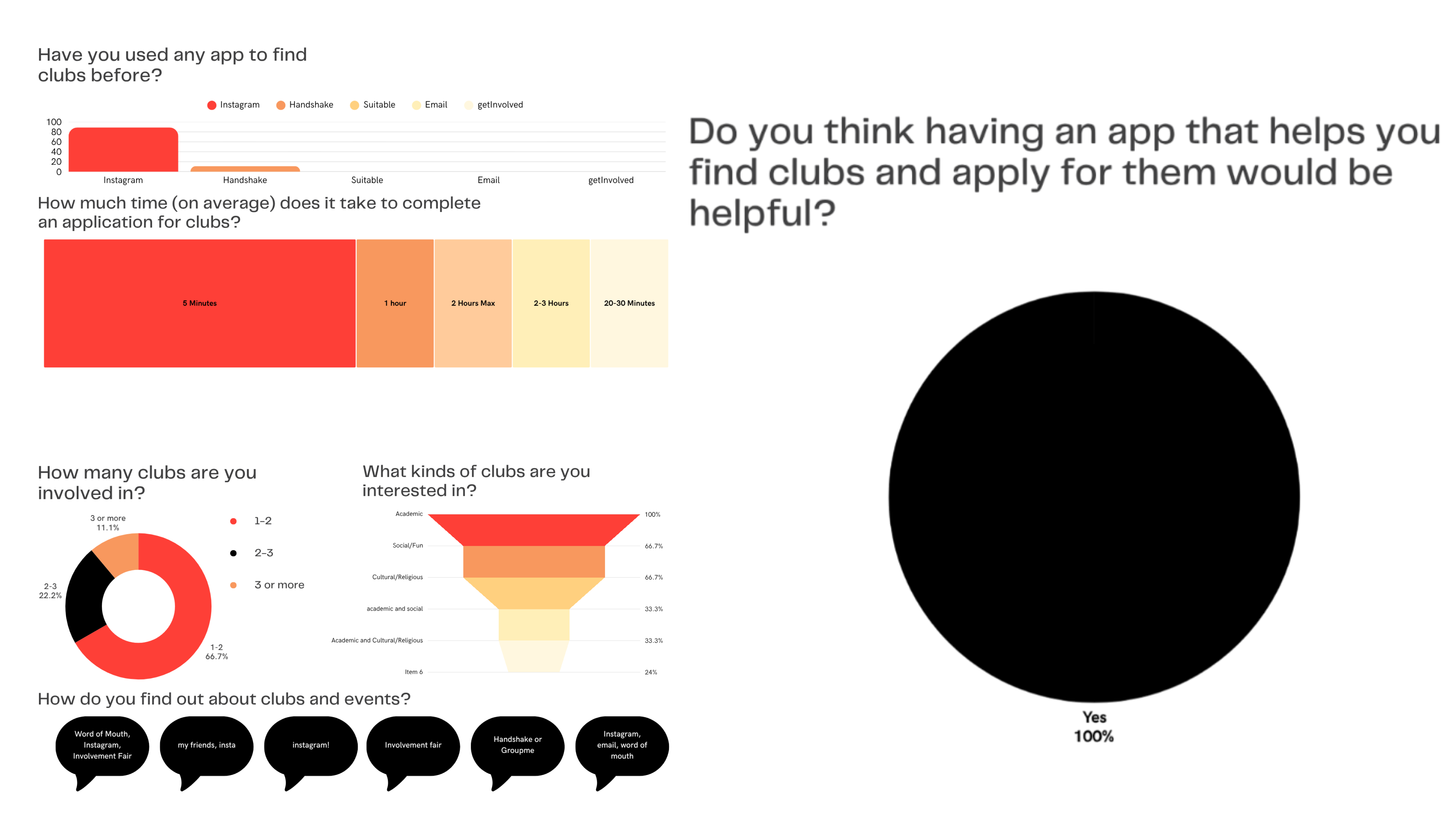 Students rely heavily on Instagram, involvement fairs, and word-of-mouth to find clubs, which is inefficient and fragmented. Applications can take anywhere from 4 minutes to 3 hours, and there’s no centralized platform for event updates.